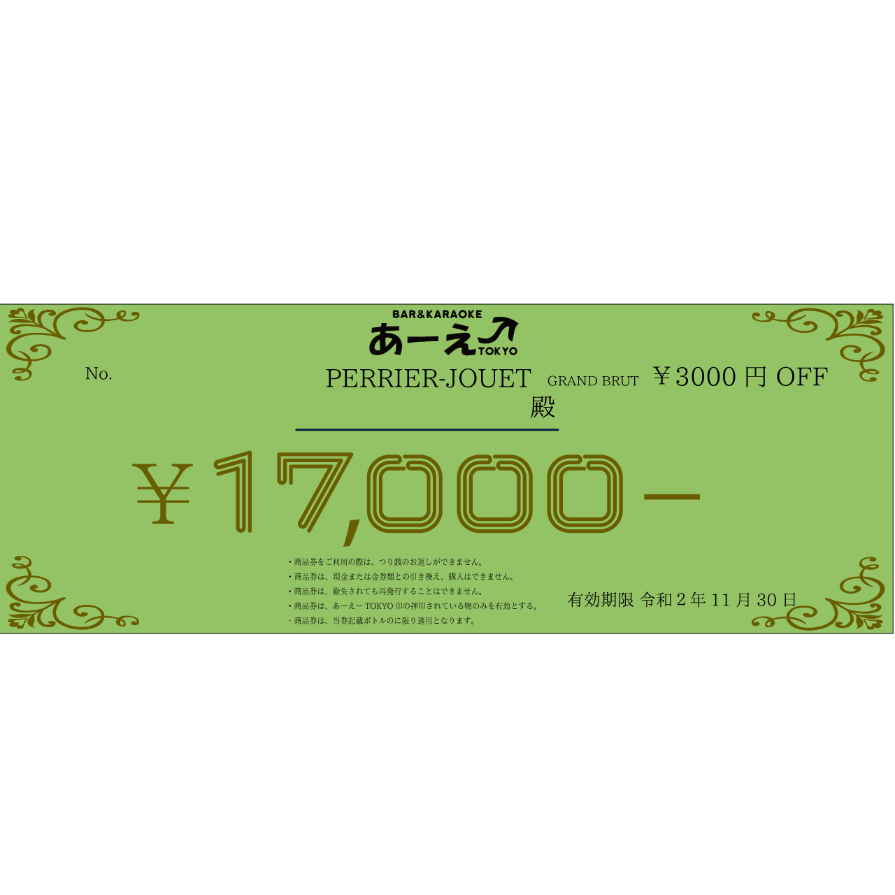 あーえーTOKYO 限定 PERRIER-JOUET GRAND BRUT ¥3000OFF券 になります。 シリアルナンバー入り及びスマートにそして、お得にご活用ください。