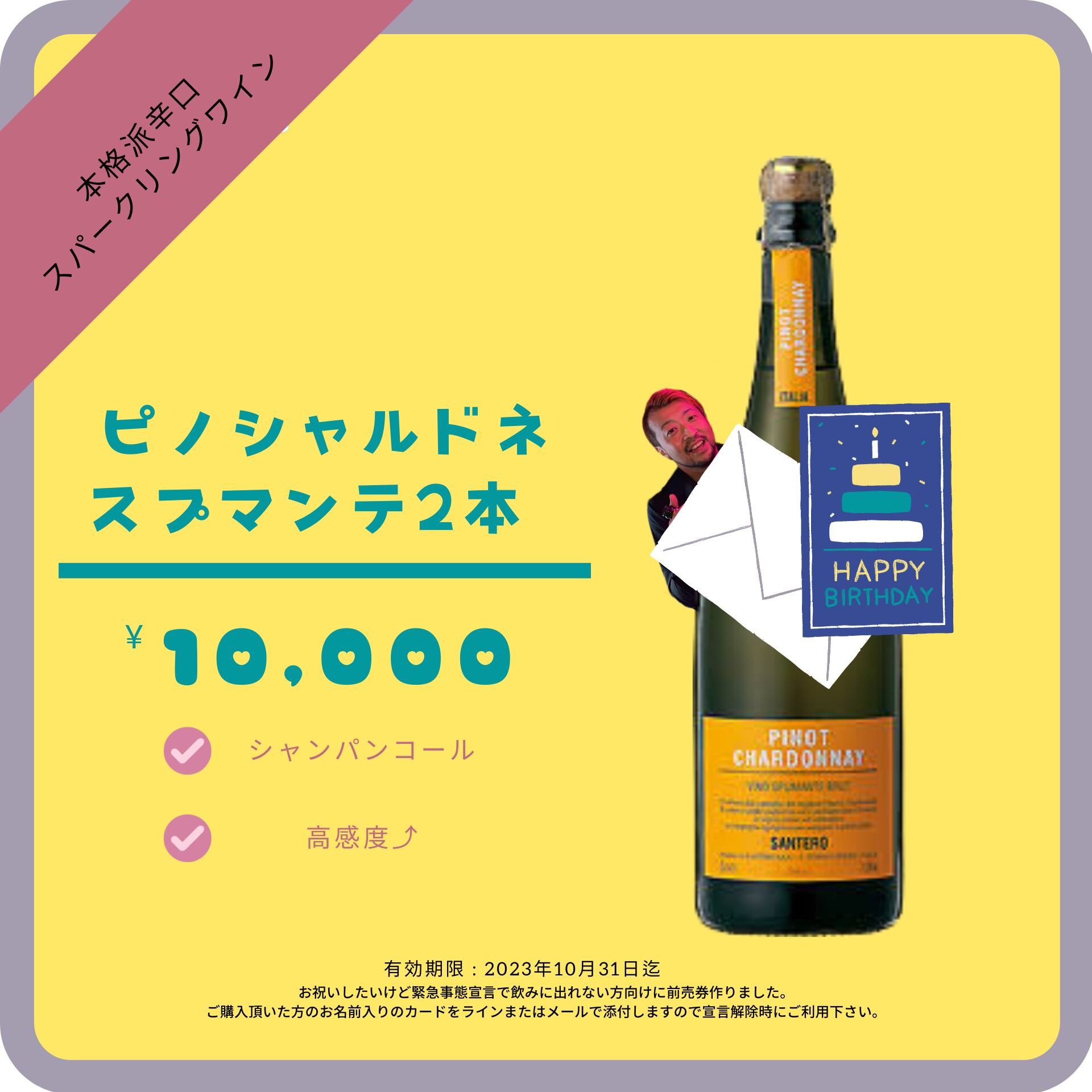 ・ボトルはサンテロ・ピノ・シャルドネ・スプマンテ(スパークリングワイン)✖️2本となります。