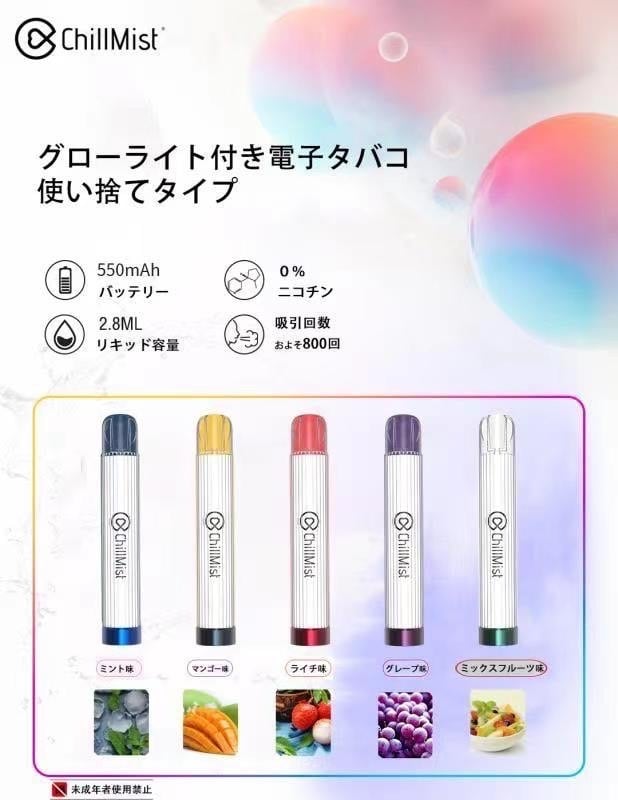 ◇特長 ・吸うと本体が様々な色に点灯して消灯します!光と煙と味をお楽しみください。 ・間隔を空けずに連続5回吸引すると常時点灯し、 常時点灯状態で間隔を空けずに連続5回吸引すると消灯します。 ・しっかりとした風味と吸いごたえ。 ・身体に有害とされているニコチンやタールゼロ。 ・タバコ特有の匂いなし。 ・受動喫煙や副流煙もありません。 ・ライターや充電器、別売りキットも必要なし。 ・メンテナンスやクリーニングの必要もなし。 カラダにも環境にも優しい「ChillMist」を 是非、この機会に一度お試しください。 ◇使用方法 1 . 吸い口を軽くくわえ、ゆっくり吸い込みお楽しください。 2. 蒸気が出なくなるまでご使用いただけます。 ◇商品仕様 ・リキッド容量:2.8ml ・リキッド成分:植物性グリセリン・プロピレングリコール・香料 ※日本食品衛生法に基づく食品添加物を使用しています。 ●バッテリー容量:550mAh ●吸引可能回数:約800回(吸い方や気圧等に差があるため800回を保証するものではありません。)